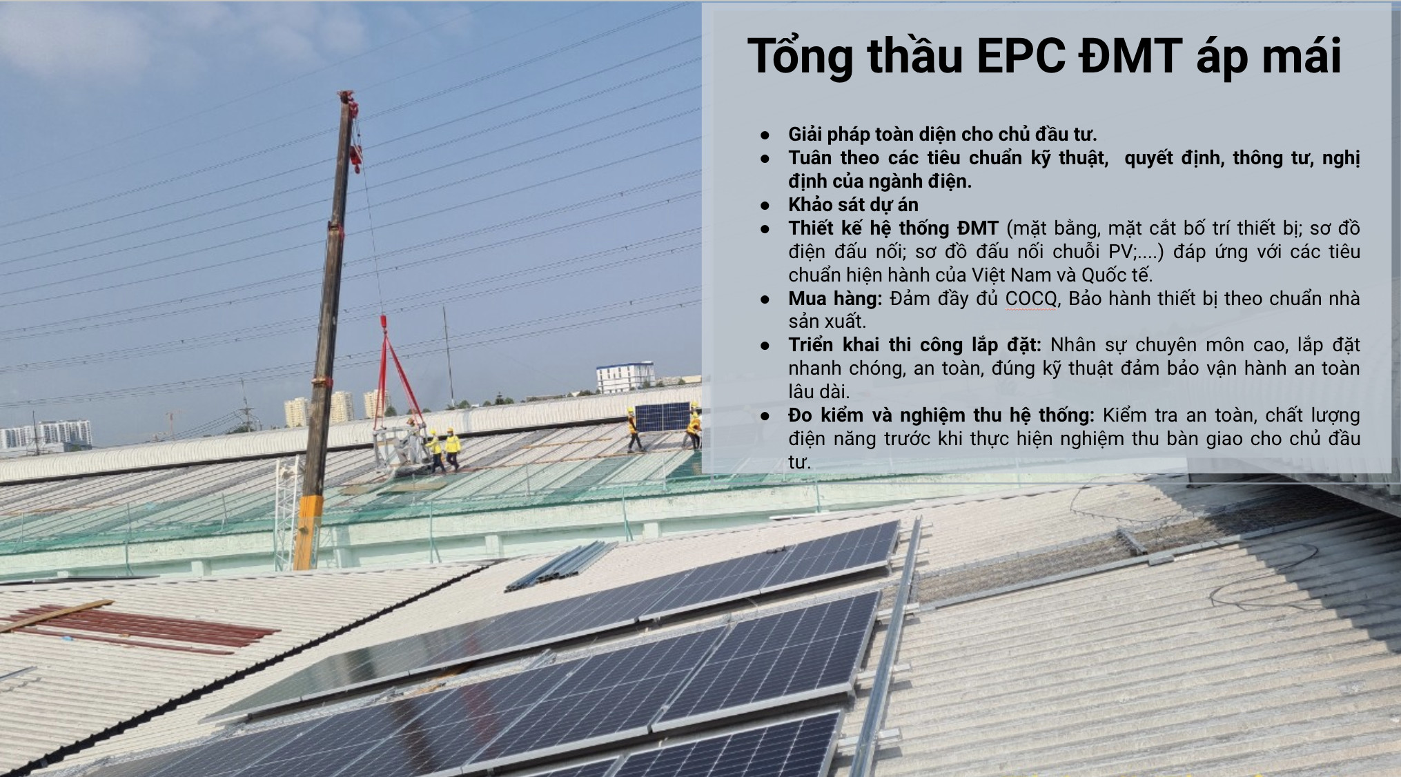 EnterPower kiểm soát từng khâu của quy trình thi công, đảm bảo rằng mọi công đoạn từ thiết kế đến lắp đặt đều tuân thủ theo chuẩn kỹ thuật và tiêu chuẩn ISO 9001:2015, ISO 14001:2015, ISO 45001:2018. Đội ngũ kỹ sư giàu kinh nghiệm thực tế của chúng tôi thực hiện kiểm tra bằng các thiết bị đo kiểm chuyên dụng, đảm bảo rằng hệ thống sau khi hoàn thành đạt hiệu suất và an toàn tối ưu.